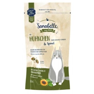 Хрустящие подушечки являются идеальной наградой для кошек, они сделаны без зерна и сахара. Хрустящие подушечки Sanabelle с курицей и шпинатом богаты курицей, содержат биотин для кожи и меха. Они богаты клетчаткой и отличаются исключительным признанием питомцев.