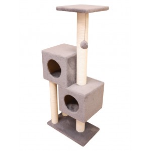 Обратите внимание на многофункциональную когтеточку-комплекс 'Двойной домик'. Она имеет внушительную высоту - 127 см. Разноуровневые площадки дают возможность лазать и гонять лапкой игрушку на резинке. Поточить коготки можно о столбика, обкрученные хлопком, а два домика могут сать укрытием для двух кошек.