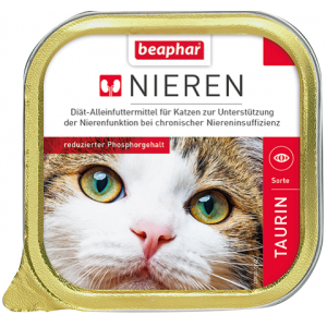 Полнорационная диета (паштет) Nieren Taurin с курицей и обогащенная таурином для поддержания функции почек при хронической почечной недостаточности у котов и кошек. Корм разработан под руководством ветеринарных врачей, чтобы удовлетворить особые потребности взрослых кошек с заболеваниями почек (хроническая и острая почечная недостаточность). Пониженное содержание фосфора и высококачественного белка уменьшает нагрузку на почки.