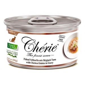 Консервы Cherie in Gravy для кошек. Смесь из хлопьев тунца с с кусочками курицы в подливке, 80г.