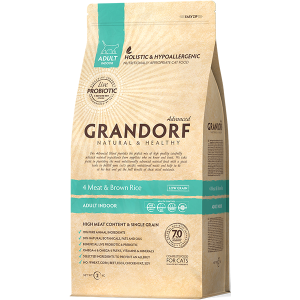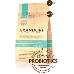 Grandorf Probiotics Adult Indoor (4 вида мяса и бурый рис) - это низкозерновой гипоаллергенный рацион для кошек, содержащий живые пробиотики.