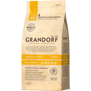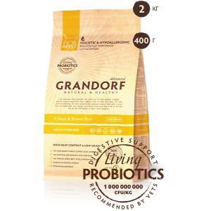 Grandorf Probiotics Adult Sterilized (4 вида мяса, бурый рис) - это низкозерновой гипоаллергенный рацион для стерилизованных кошек и кастрированных котов, содержащий живые пробиотики.