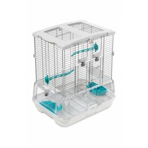 Для волнистых попугаев, канареек, неразлучников и зябликов. Клетка оснащена двуми кормушками/поилками, двумя жердочками, высоким прозрачным бортиком в нижней части клетки, что предотвращает разбрасывание корма птицами. Удобные отверстия для для доступа.
