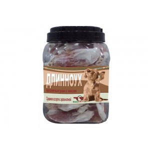 Состав: кроличьи уши (хрящи), мясо кролика, соль. Компонентный состав на 100 г: белки – 26г, жиры – 4г.