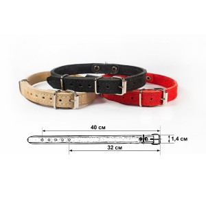 Ошейник для животных небольших размеров с обхватом шеи от 34см до 42см. Ширина 14мм. Изготавливается из двух слоёв мягкого цветного кожаного спилка выделанного «под замшу». Фурнитура металлическая никелированная. Полукольцо сварено встык. Варианты цветов — различные. Предназначен для ежедневного выгула животного.