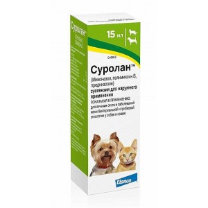 | Ветаптека | Суролан (SUROLAN) 15 мл - (Миконазол, полимиксин В, преднизолон). Препарат применяется для лечения отитов различной этиологии (паразитарной, бактериальной, грибковой) у собак и кошек. |
