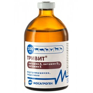 Название (лат.) Trivit pro injectionibus Состав и форма выпуска Тривит получают путем растворения синтетических витаминов — ретинола ацетата или пальмитата, холекальциферола и альфа-токоферола в масле. В 1 мл раствора содержится 30000 МЕ витамина А, 40000 МЕ витамина D3, 20 мг витамина Е и стабилизатор. Представляет собой прозрачную жидкость от светло-желтого до светло-коричневого цвета, со свойственным растительному маслу запахом. Выпускают стерильно расфасованным во флаконы по 10 и 100 мл. Фармакологические свойства Является комбинированным препаратом, в котором витамины А, D3 и Е приведены в физиологически обоснованных соотношениях. Препарат оказывает проявлять синергизм действия на организм животных, выражающееся в нормализации обмена веществ, повышении устойчивости против инфекционных заболеваний, стимулировании роста молодняка и повышении плодовитости. Показания Профилактика и лечение гипо- и авитаминозов А, D и Е и заболеваний, развивающихся на их фоне (ксерофтальмия, рахит, остеомаляция).